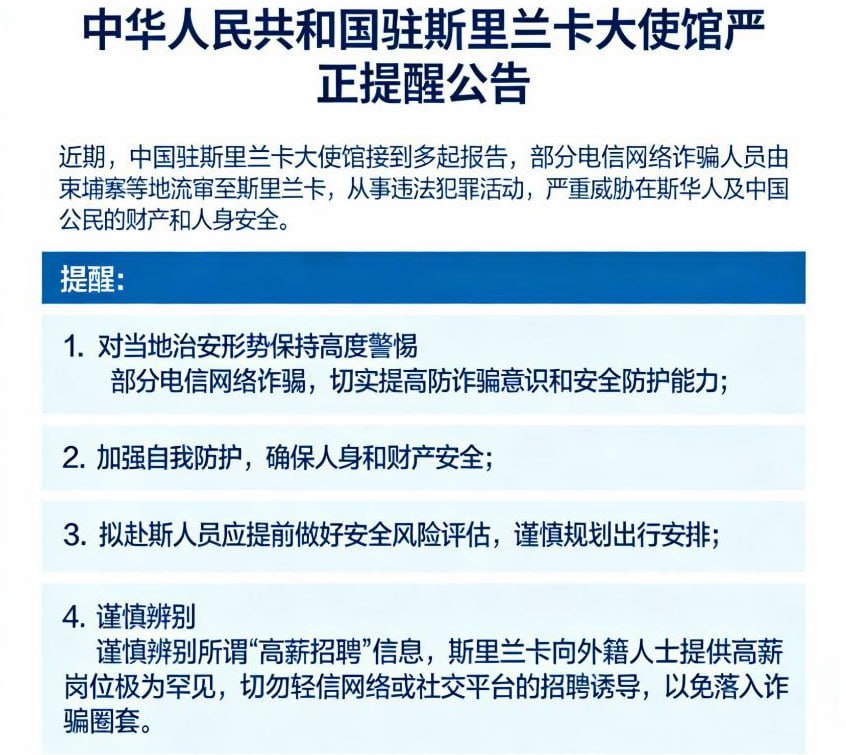中国驻斯里兰卡大使馆坚决支持并配合斯里兰卡执法部门依法严厉打击流窜诈骗人员及各类电信网络诈骗违法活动,坚决反对任何势力将斯里兰卡变为诈骗聚集地或跨境犯罪中转站。